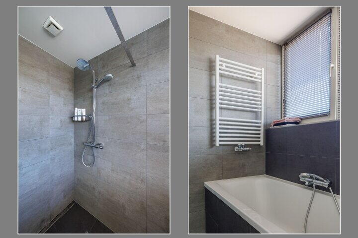 De badkamer is voorzien van een inloopdouche, ligbad, dubbele wastafel en designradiator.